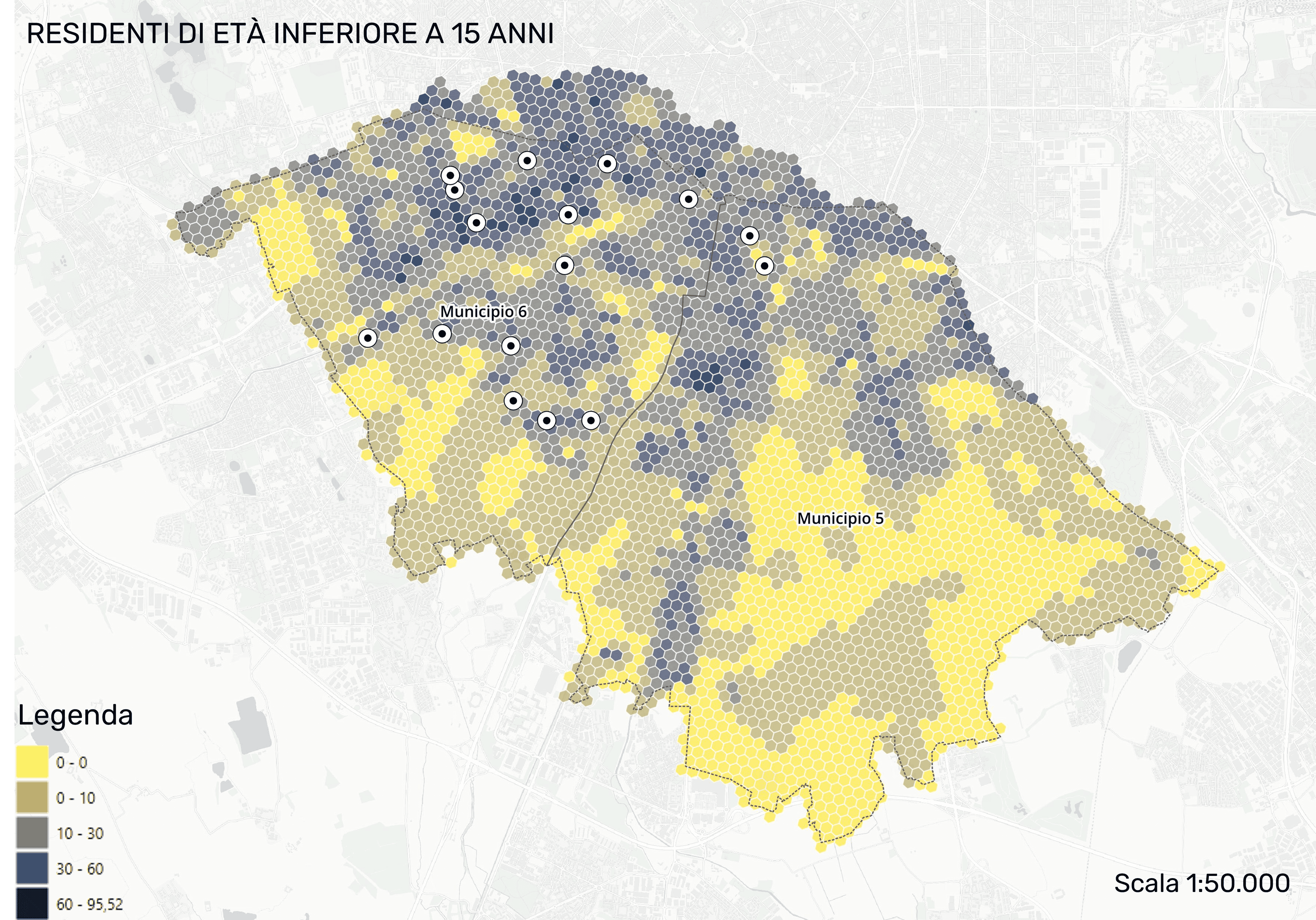 Spatial analysis focused on Municipi 5 and 6 in Milan, examining 16 school complexes, selected by Polimi-DAStU. For each school, a 15-minute walking isochrone was calculated based on the actual street network and an average walking speed of 4.5 km/h, representing the catchment area accessible by foot. Spatial analysis was conducted to understand how urban environmental conditions and socio-demographic factors interact to create differentiated exposure patterns around schools.