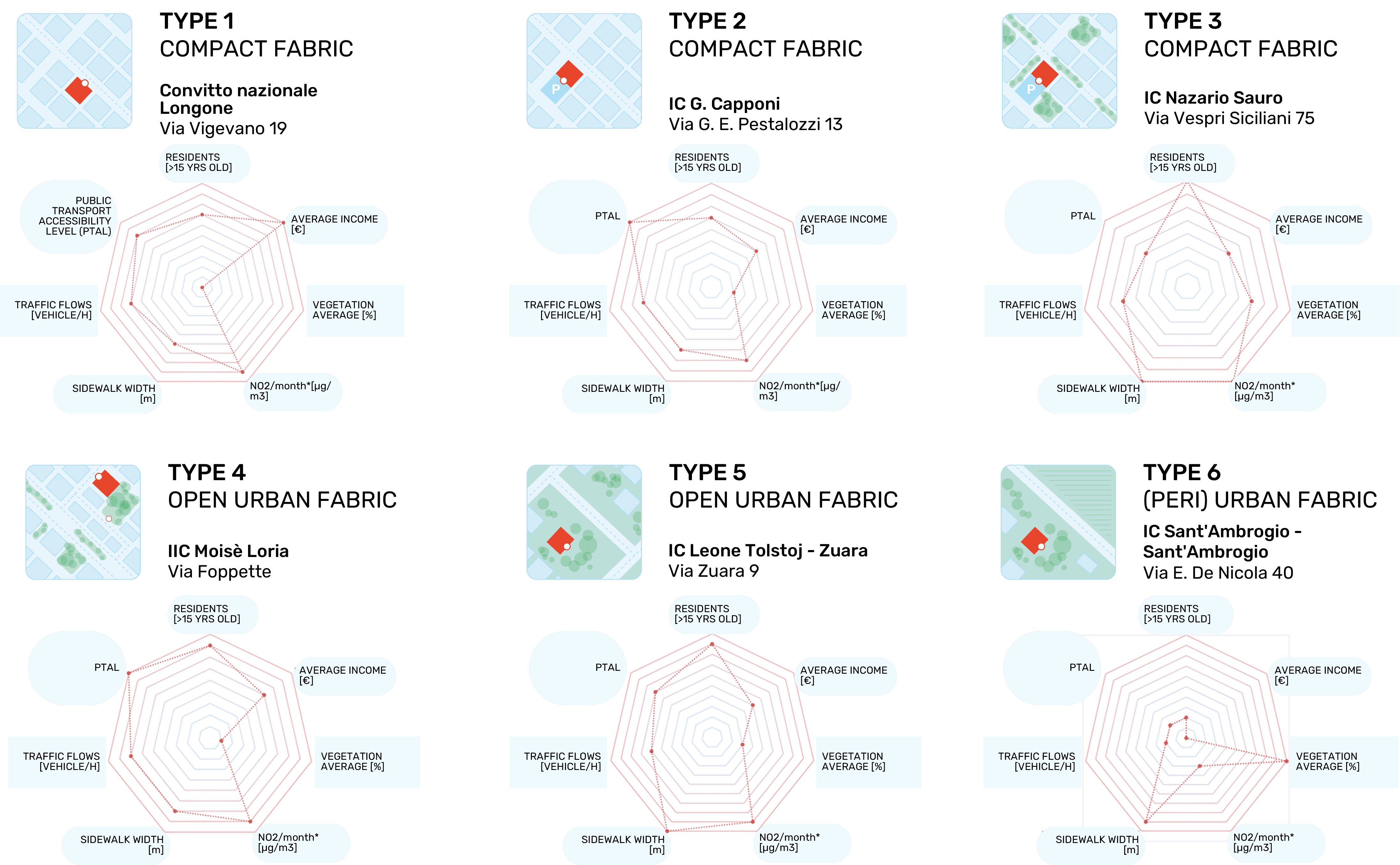 The multi-indicator mapping revealed significant spatial variation across Municipi 5 and 6, with school catchments displaying different environmental and socio-demographic conditions (see Figure 2). The Polimi-DAStU team selected 16 case-studies for analyses and then grouped them into six urban typologies based on their built environment profiles: three compact urban fabric types (i.e., types 1-3) and three open or peri-urban fabric types (i.e., types 4-6), reflecting different combinations of building density, proximity to traffic axes, and availability of green spaces.
