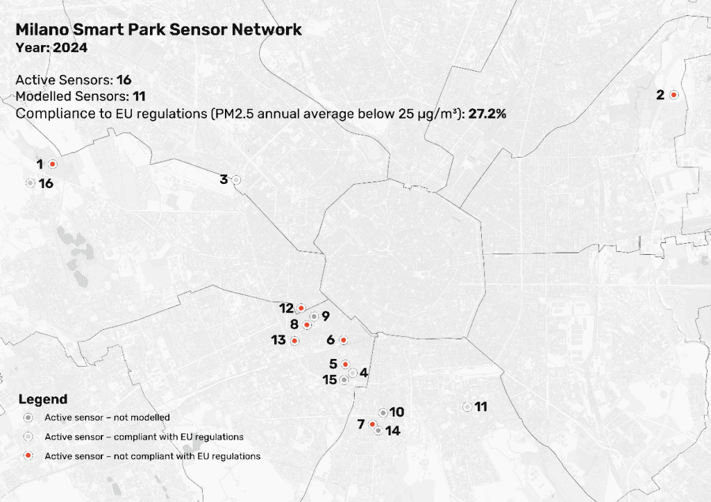 Raw data from the 16 sensors from Associazione Parco Segantini was used to perform the analysis and modelling. Results show that the 16 sensors, active between 2020 and 2024, captured consistent PM2.5 patterns across the network. Annual means showed a general downward trend between 2020 and 2023, followed by a partial increase in 2024 in several sensors. All sensors systematically exceeded the WHO guideline (5 µg/m³). Compliance with the EU limit (25 µg/m³) varied by year and location (see Figure 4).