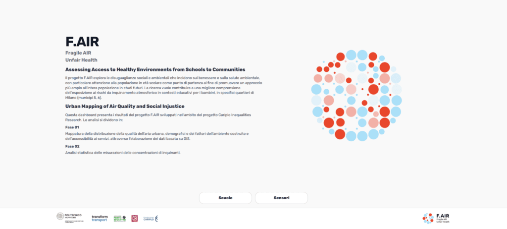 The F.AIR (Fragile AIR – Unfair Health) project “Assessing Access to Healthy Environments from Schools to Communities” was developed by a multidisciplinary consortium led by Politecnico di Milano Department of Architecture and Urban Studies (DAStU), and including Transform Transport, Associazione Parco Segantini, and University of Milan-Bicocca Department of Environmental and Earth Sciences (DISAT), with funding from Fondazione Cariplo under the Inequalities Research program. The project, developed between March 2025-26, explores social and environmental inequalities that impact well-being and environmental health, with a particular focus on the school-age population. The research aims to contribute to a better understanding of exposure to air pollution risks in educational contexts for children, in specific neighborhoods of Milan.